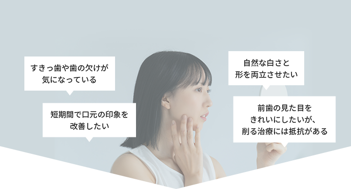 前歯の色や形が気になる方、歯をできるだけ削りたくない方、すきっ歯や軽い欠けを改善したい方に向いています。